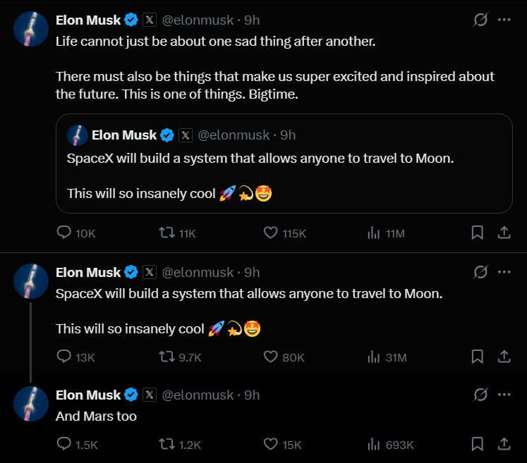 “SpaceX ஒரு அமைப்பை உருவாக்கும், அது யாரையும் சந்திரனுக்குப் பயணிக்க அனுமதிக்கும்” (பட ஆதாரம் – X/Elon Musk)